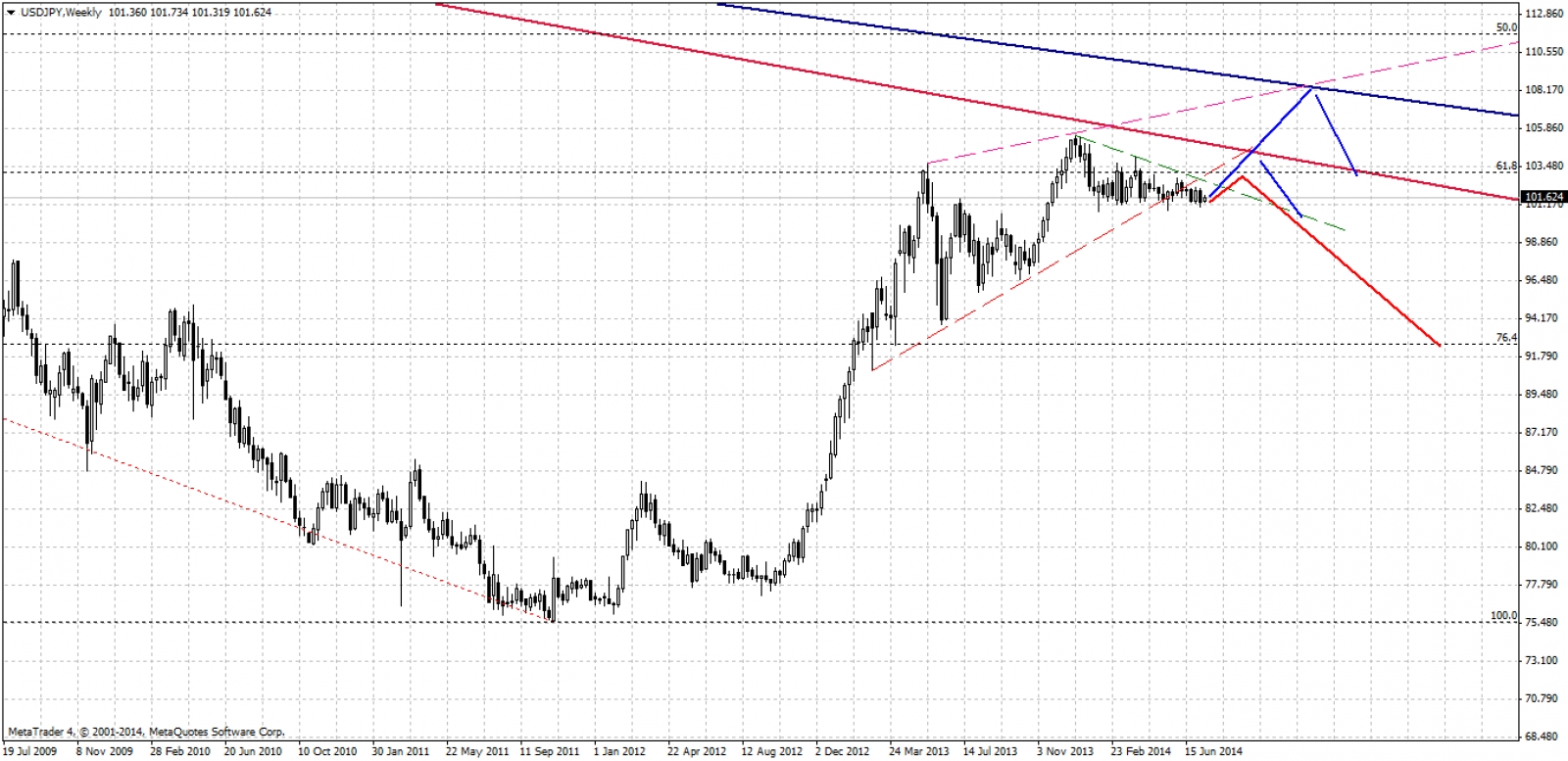 хотя стоп, посмотрел тут на важные линии на недельном, если 107 — это пробой глобадьного нисходящего движения. самый простой даже не прогноз, а предположение)