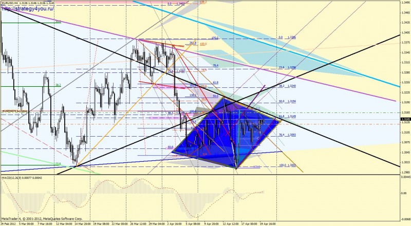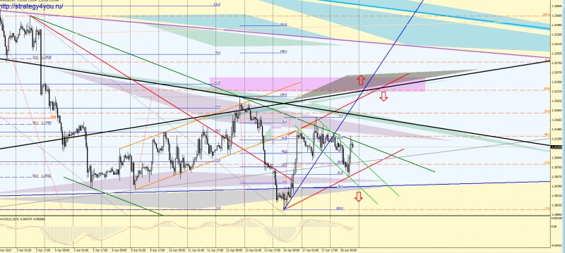 Обратите внимание, что все это движение, может быть обычной коррекцией на все движение нисходящее с максимумом от 2-3 апреля 2012 года. Если провести канал по минимумам сегодня и понедельника + максимумам понедельника + вторника, то вероятна остановка и даже отбой от восходящей черной линии тренда + уровень 61,8 этого движения + построенный канал по указанным точкам.