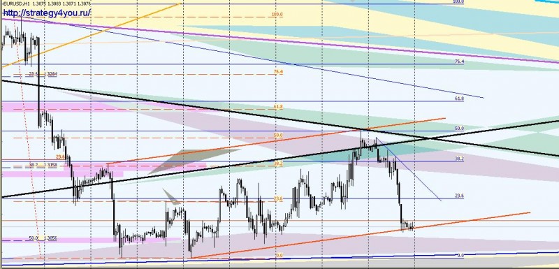 4) Продажи от оранжевой линии канала по коррекции прошлой недели + уровень 61,8% по Фибоначчи от последнего нисходящего прошлой недели + зеленая линия канала верхняя. Или 38,2% (если цена в понедельник резко идет вверх, хотя по-моему это мало вероятно). Стоп-лосс — выше следующего уровня Фибоначчи — 76,4% + по возможности черная нисходящая линия тренда. Профит все тот же — синяя нижняя линия треугольника и дальше по пункту (1) для продаж.