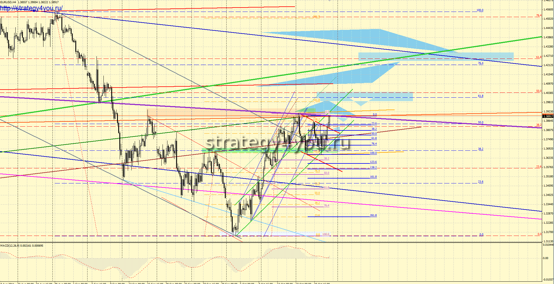 Форекс прогноз по EURUSD на 24-28 октября 2011 + кратким аналитическим обзор движения цены по валютной паре EURUSD за прошлую неделю, согласно правил и стратегий форекс графического анализа: