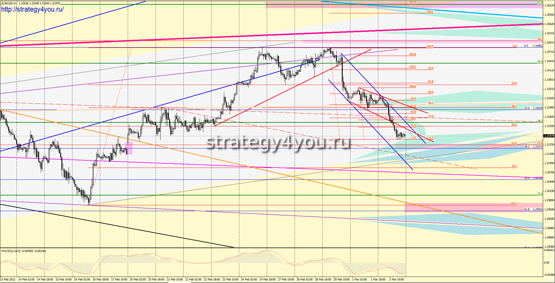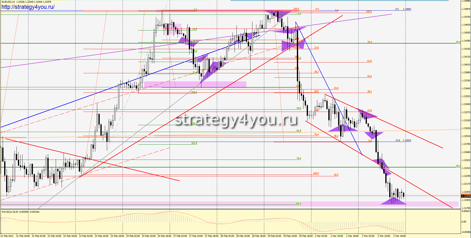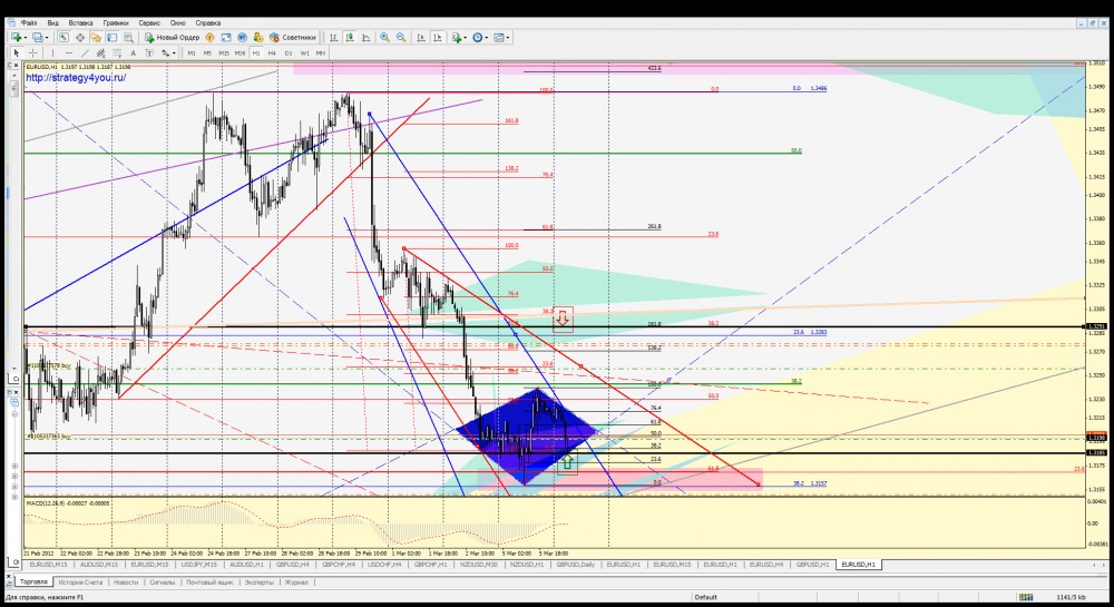 Уважаемые трейдеры, предлагаю вашему вниманию свой очередной форекс прогноз по EURUSD на следующую торговую неделю: 5 — 9 марта 2012 года, а так же аналитический обзор движения цены, согласно правил графического анализа форекс, и стратегии форекс, описанной в видеокурсе «Безопасный форекс».