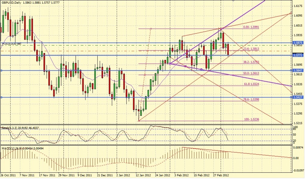 После незначительного отката вверх — к уровню 23,6% по Фибоначчи от последнего нисходящего движения, происходит снова отбой вниз и цена опускается к светло-розовой долгосрочной линии тренда, но только с 2-й попытке происходит ее ретест + ретест уровня 61,8% от движения вверх с минимумом от 21 февраля + 38,2% от движения вверх с минимумом от 16 февраля + 23,6% по Фибоначчи от движения вверх с минимумом 16 января 2012 года. Не смотря на такой важный уровень сопротивления, отбой вверх был не очень большим — максимум 23,6% по Фибоначчи от последнего движения вниз. День закрыт свечей неопределенности.
