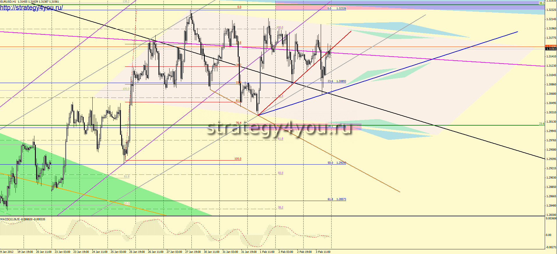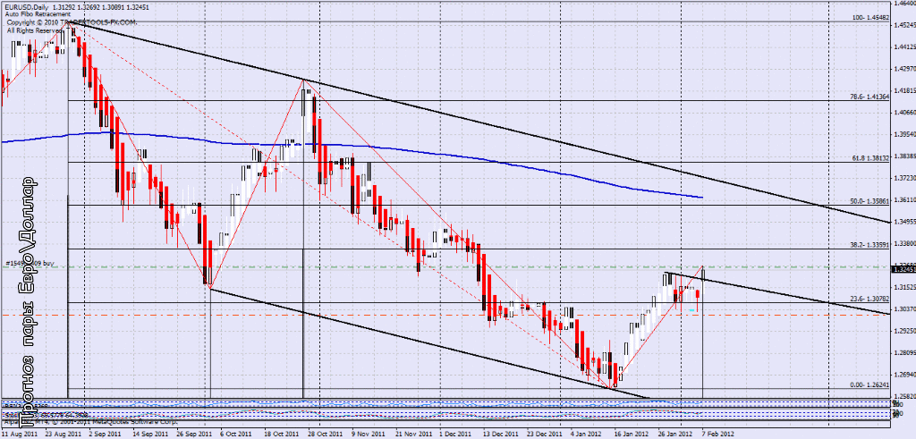 Уважаемые трейдеры, сегодня предлагаю сделать только краткий аналитический обзор EURUSD + так же краткий форекс прогноз EURUSD на следующую неделю — 6-12 февраля 2012 года, так как цена целую неделю торговалась в диапазоне 200 пунктов и мы получили закрытие недели практически на уровне открытия прошлой