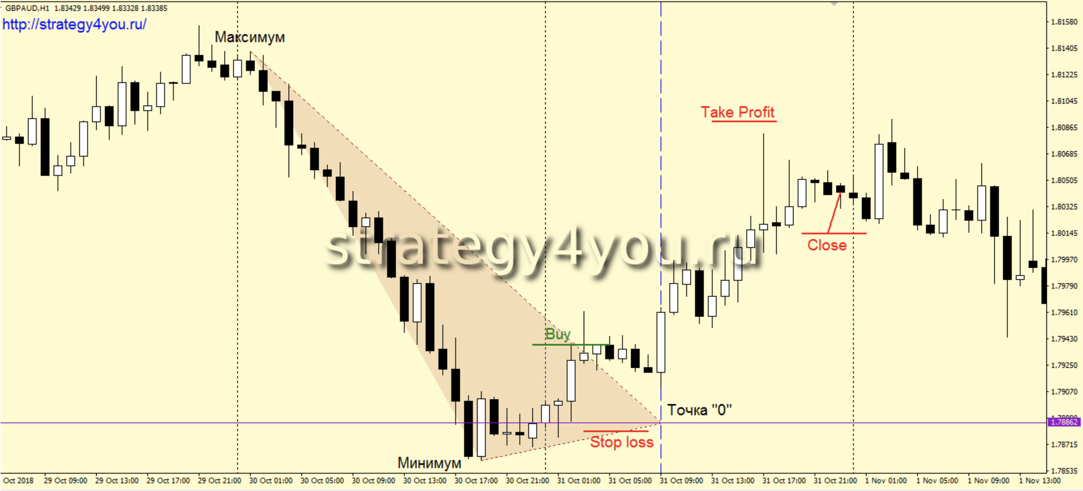 8 ) Стоп-лосс устанавливается на 5 пунктов ниже точки «0». Минимальный размер стопа 30, а максимальный – 60 пунктов.