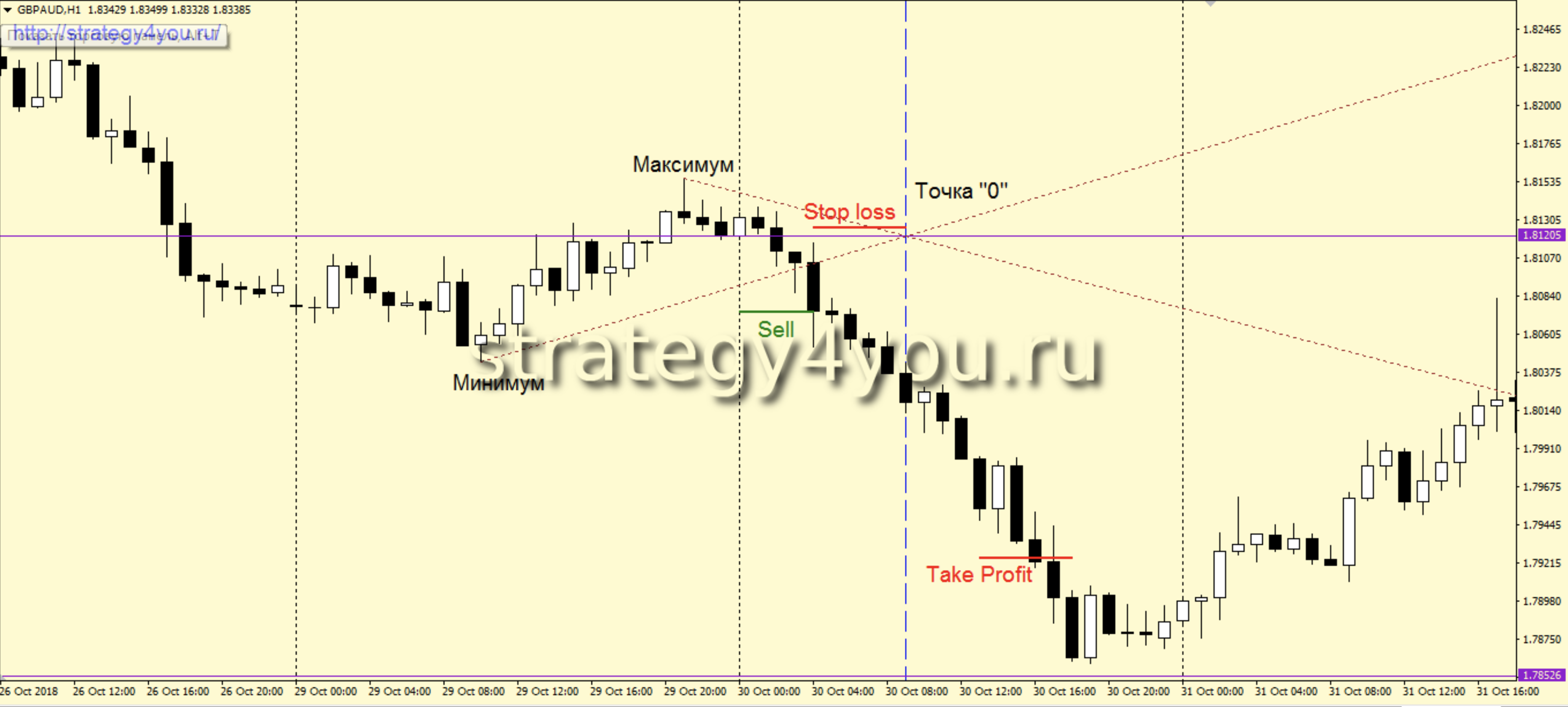 8 ) Страховочный стоп-лосс нужно установить на 5 пунктов выше точки «0». Минимальный размер стопа — 30 пунктов, а максимальный – 60.