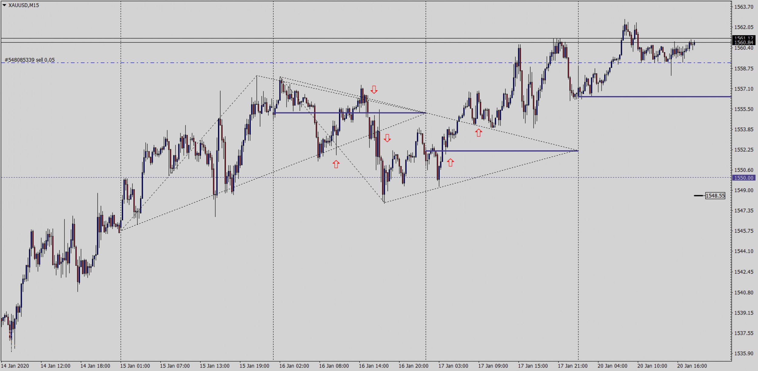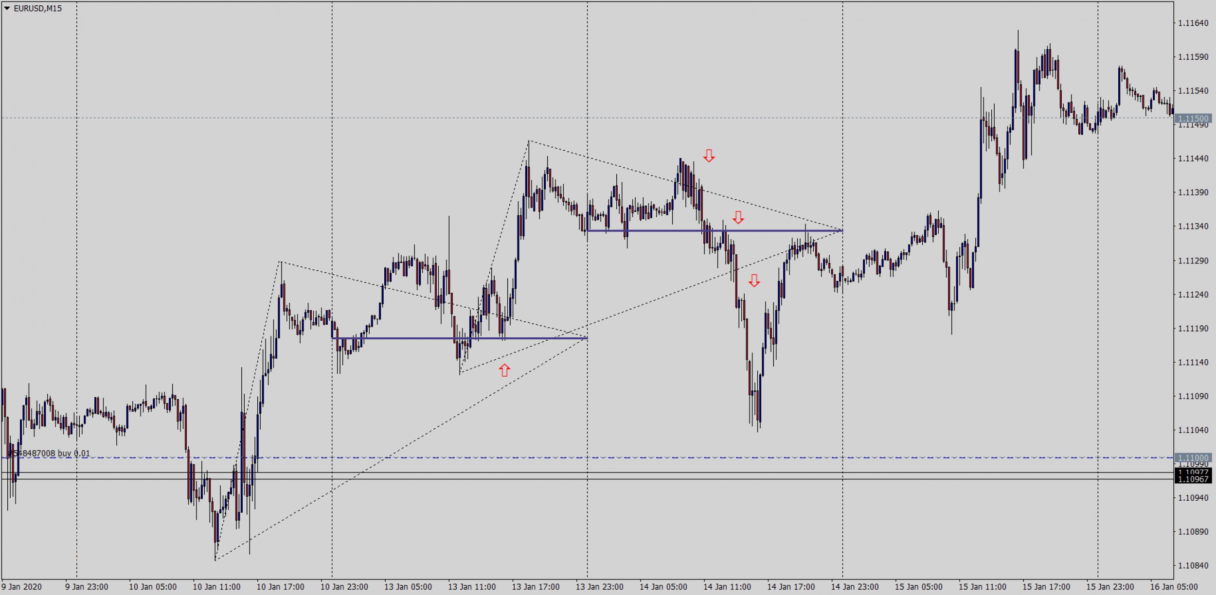 7) Если очередная свеча закрывается выше верхней линии этого треугольника (интересует именно цена закрытия), то на открытии следующей свечи заключается сделка на покупку.