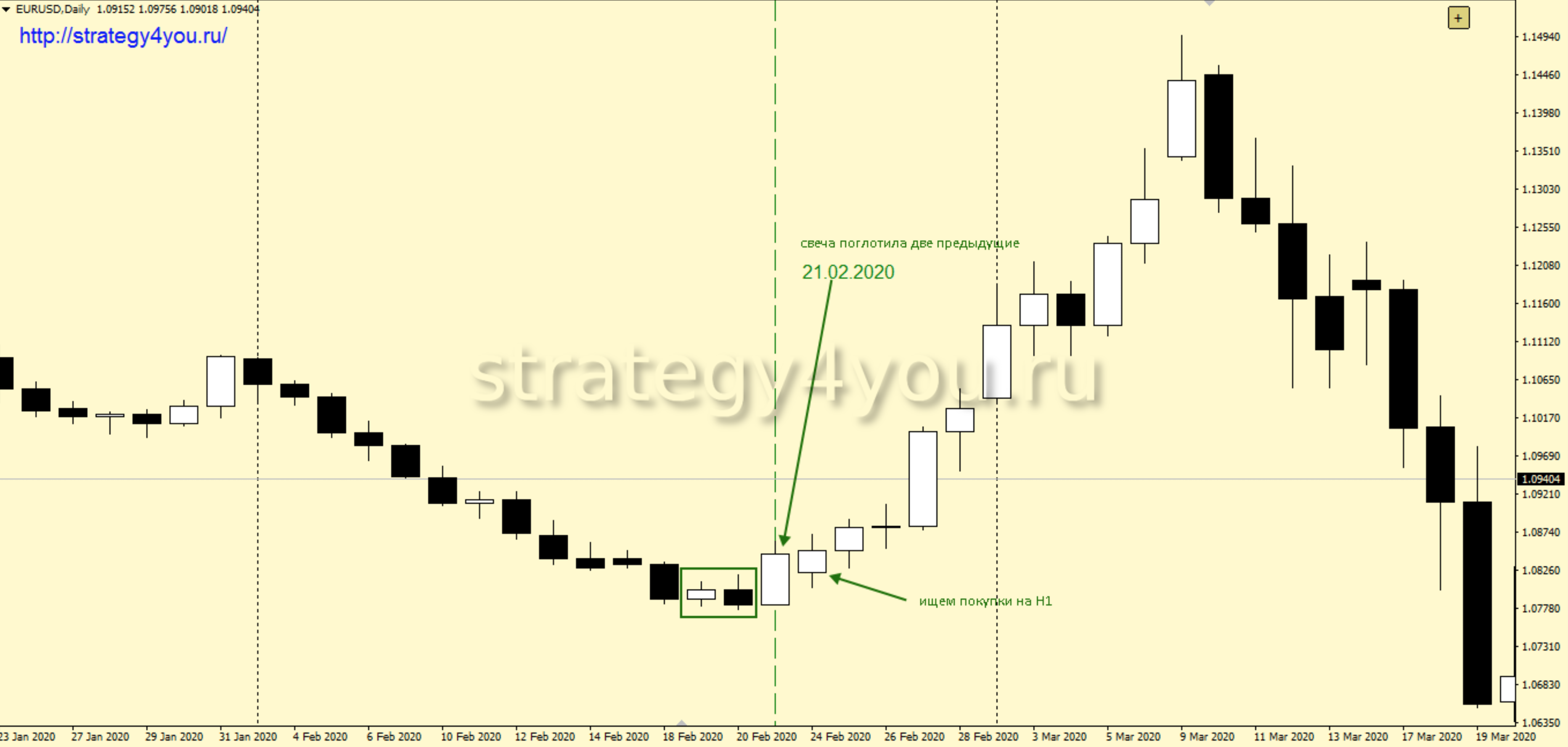 1) На дневном интервале формируется белая свеча, которая поглотила минимум две предыдущие свечи (их тела).