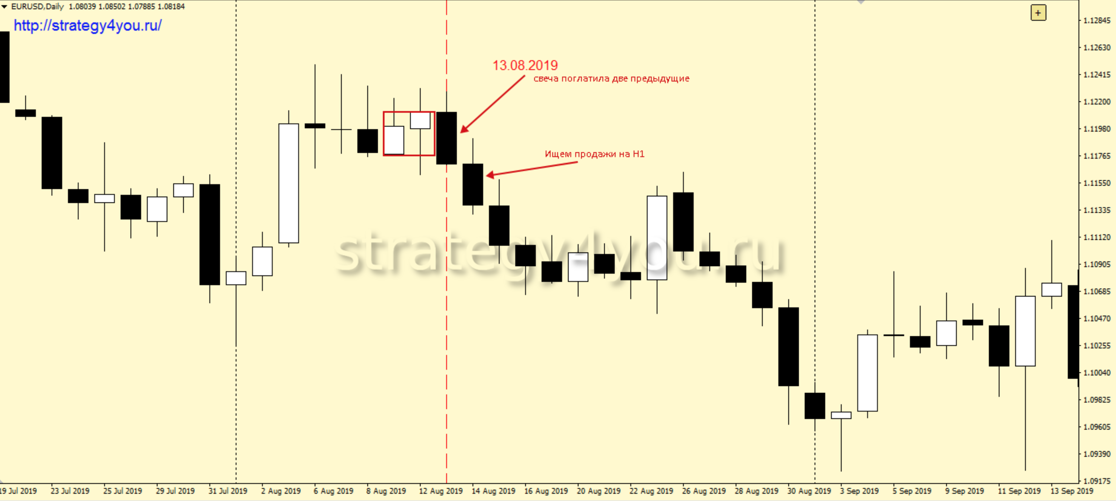 1) На D1 интервале формируется черная свеча, которая поглотила минимум 2 предыдущие свечи (их тела).