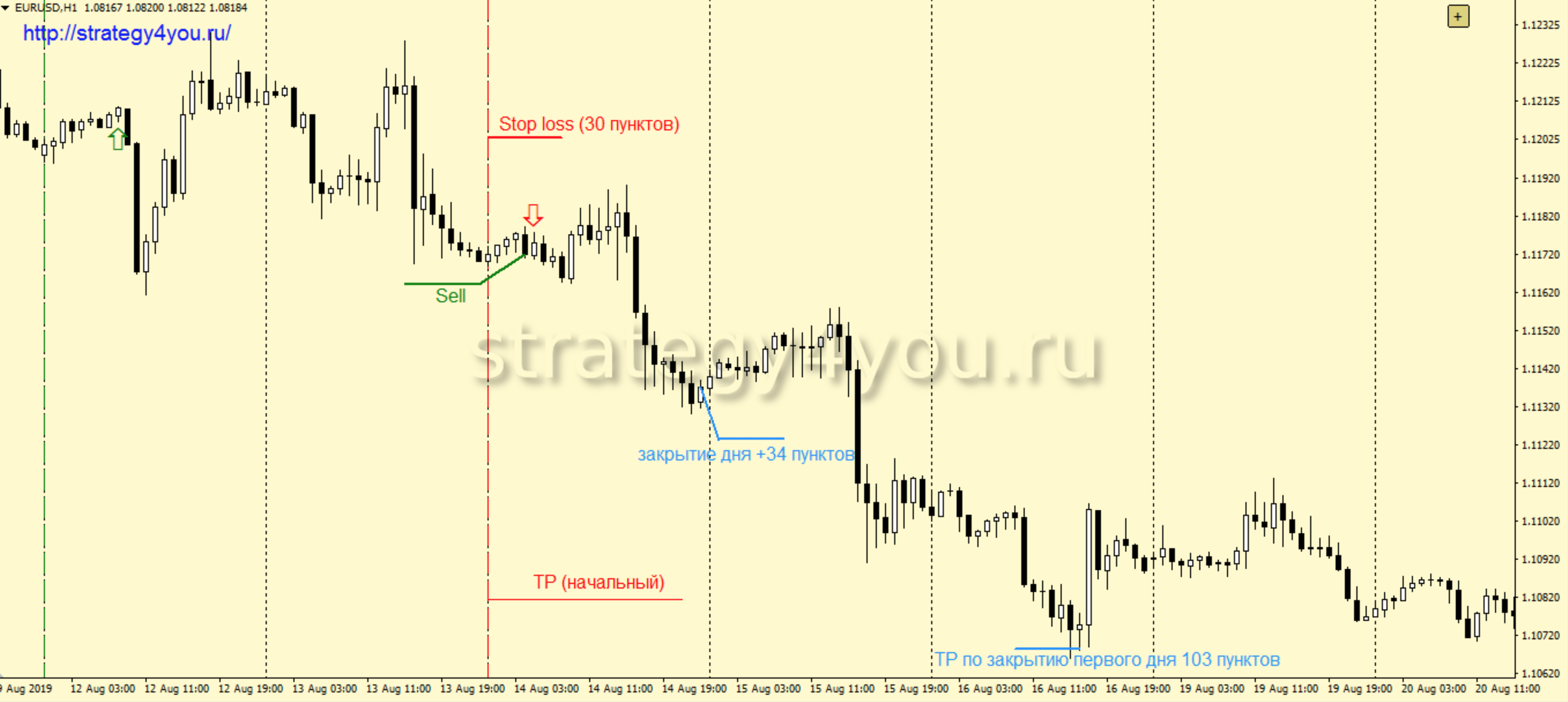 2) На следующий торговый день на H1 интервале ищем вход на продажу.