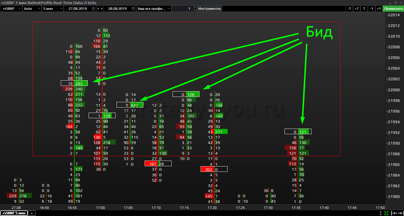 - Применение графика с изображением Бид-Аск, который построен по количеству сделок с указанием количества контрактов, проторгованных в каждом пункте цены. Способ позволяет лучше проанализировать движение участников рынка, чем в классическом варианте.