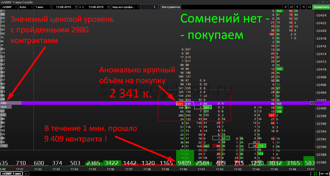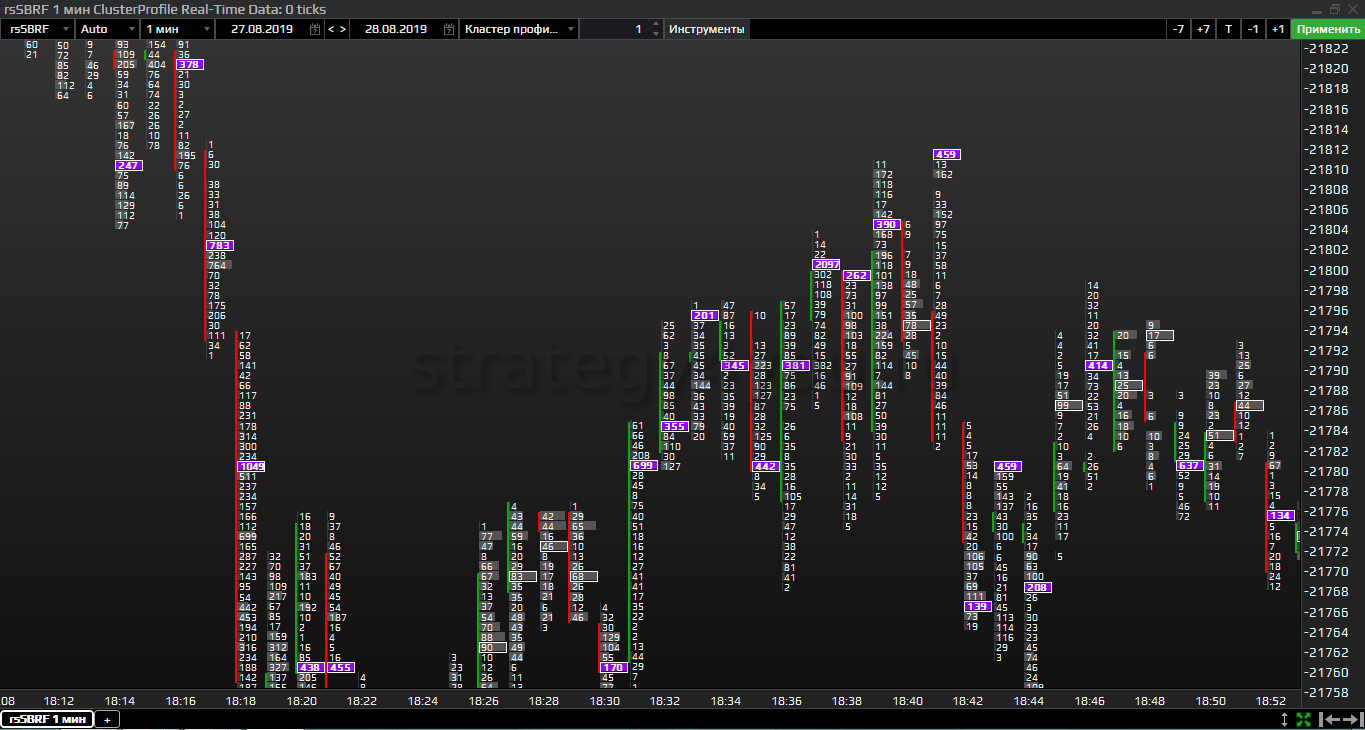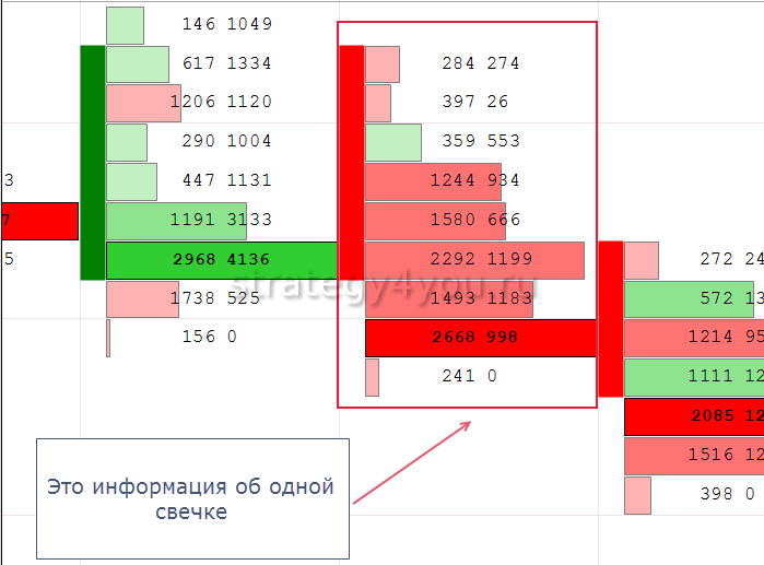 Инструмент представляет собой детальный обзор каждой японской свечи по проторгованному объему. Преобладание продаж окрашивает индикатор в красный цвет, и часть контрактов относится к левой колонке кластера. Для бычьих свечей применяется противоположное действие. Большие величины сигнализируют о наборе или срабатывании стопов, это требуется проверить в зависимости от направленности и характера расположения объема.