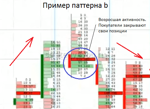 Второй паттерн, напоминающий латинскую букву «b», является обратным, называют аналогичным образом — «би». Зауженное тело в верхней части свечи, расширенное в нижней половине, свеча нисходящая. В верхней части объемов не наблюдалось, а ближе к основанию уровень сделок начал стремительно расти. Этот паттерн свидетельствует о выходе покупателей из позиций.