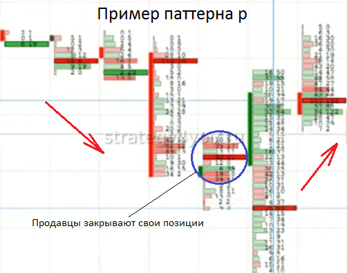 Паттерн внешне напоминает латинскую букву «р» — зауженное тело в нижней части и расширенный размер — верхней, свеча, растущая без больших теней. Форма графика свидетельствует о выходе продавцов из позиций. Сигнал рассматривается в случае, если перед образованием было нисходящее движение. Паттерн «р» не используется, если он образуется во флэте либо при росте цены.