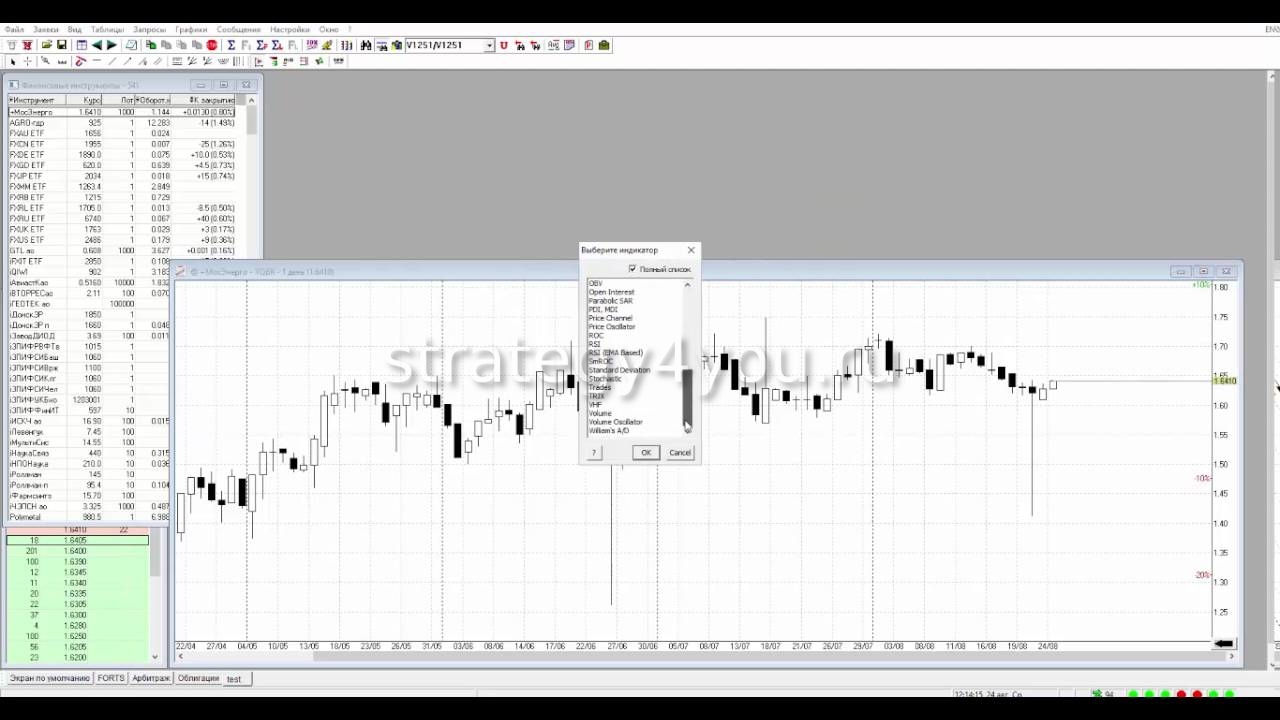 Перед совершением сделки можно добавить на график индикатор. Нужно кликнуть правой клавишей мыши по любой части графика и выбрать в меню «Добавить индикатор…». Откроется окно с пустым полем. Чтобы увидеть все доступные индикаторы, следует поставить отметку в графе «Полный список».