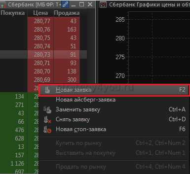 Процедура подачи заявки через Квик ничем не отличается от вышеописанной: двойным кликом из биржевого стакана (в этом случае цена выставляется автоматически) или вручную через меню «Новая заявка».