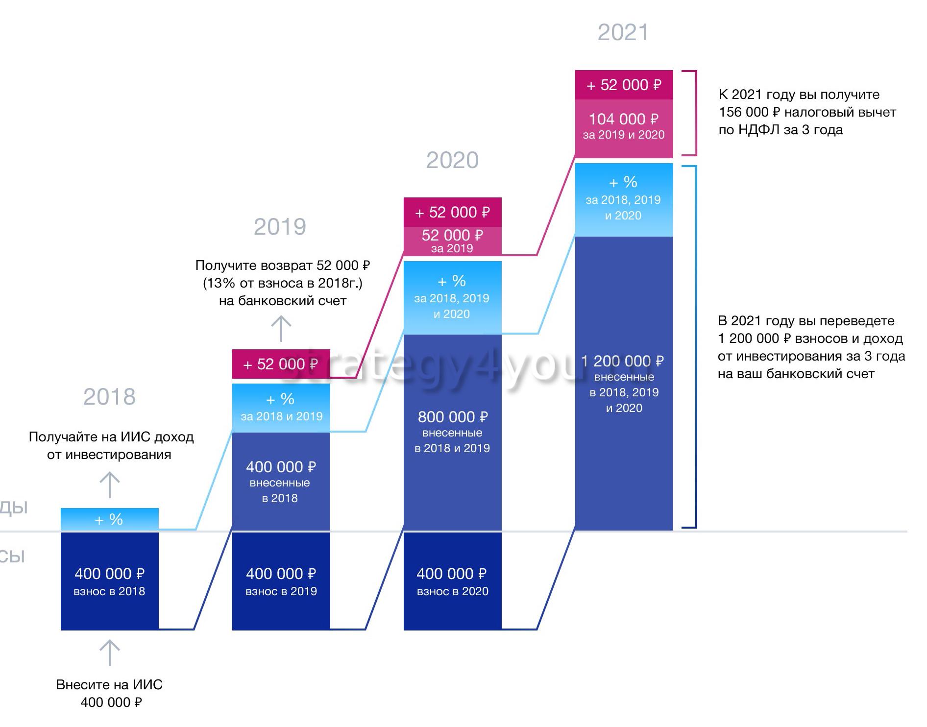 Называется также типом А. Из ежегодных взносов вычету подлежат 13%. Сумма для расчета не превышает 400000 руб., несмотря на то, что внести разрешается до 1000000 руб. Это означает, что вычет за 12 месяцев не превысит 52000 руб.