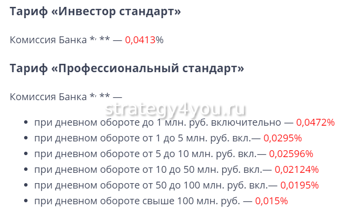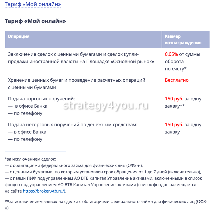 Биржа удерживает комиссию за сделки в размере 0,01%, за обслуживание снимается 150 руб. при условии, что был оборот. То, сколько платить ВТБ брокеру, зависит от суммы оборотов, если речь идет о «Профессиональном стандарте». В тарифе «Мой онлайн» ему полагается 0,05%, а в «Инвестор стандарт» — 0,413%.