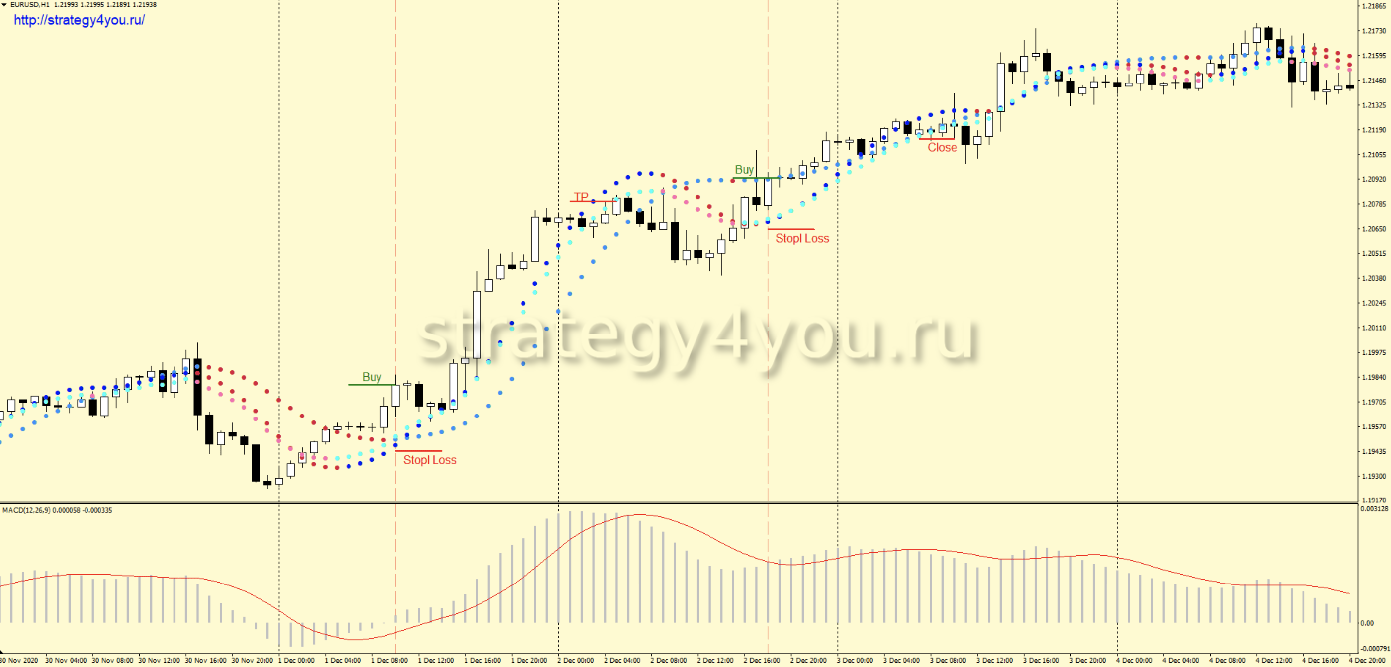 - Торговля ведется на паре: EUR/USD, интервал — H1.