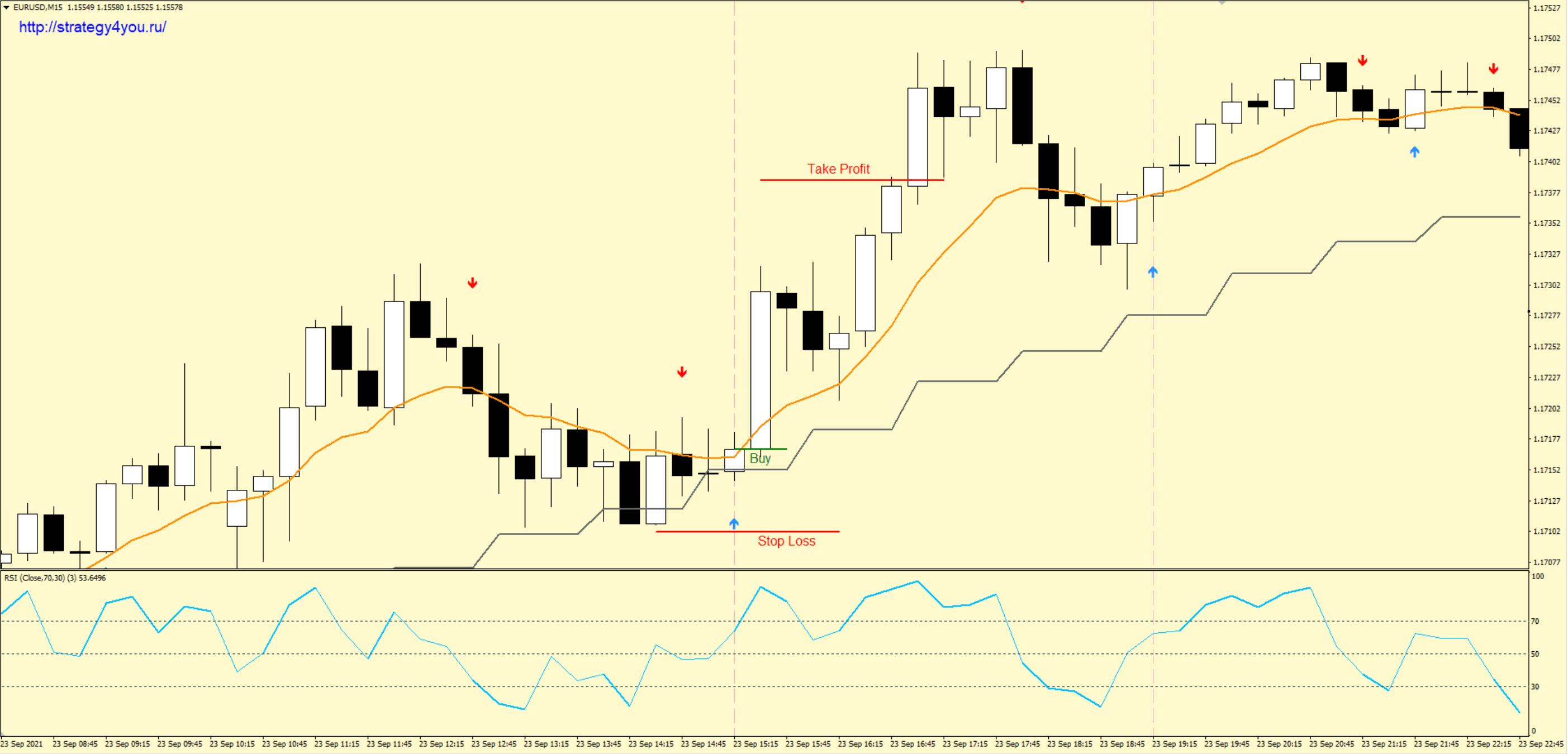 - Торговля ведется на паре: EUR/USD, интервал — M15.