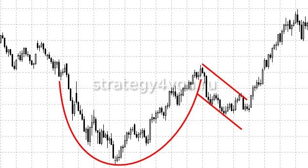 «Чашка с ручкой» — такой термин был выбран из-за несомненного сходства между этим видом посуды и тем, что трейдер видит на графике. Насколько востребована эта конструкция у участников торгов, судить сложно, т.к. есть представляющие больший практический интерес фигуры.