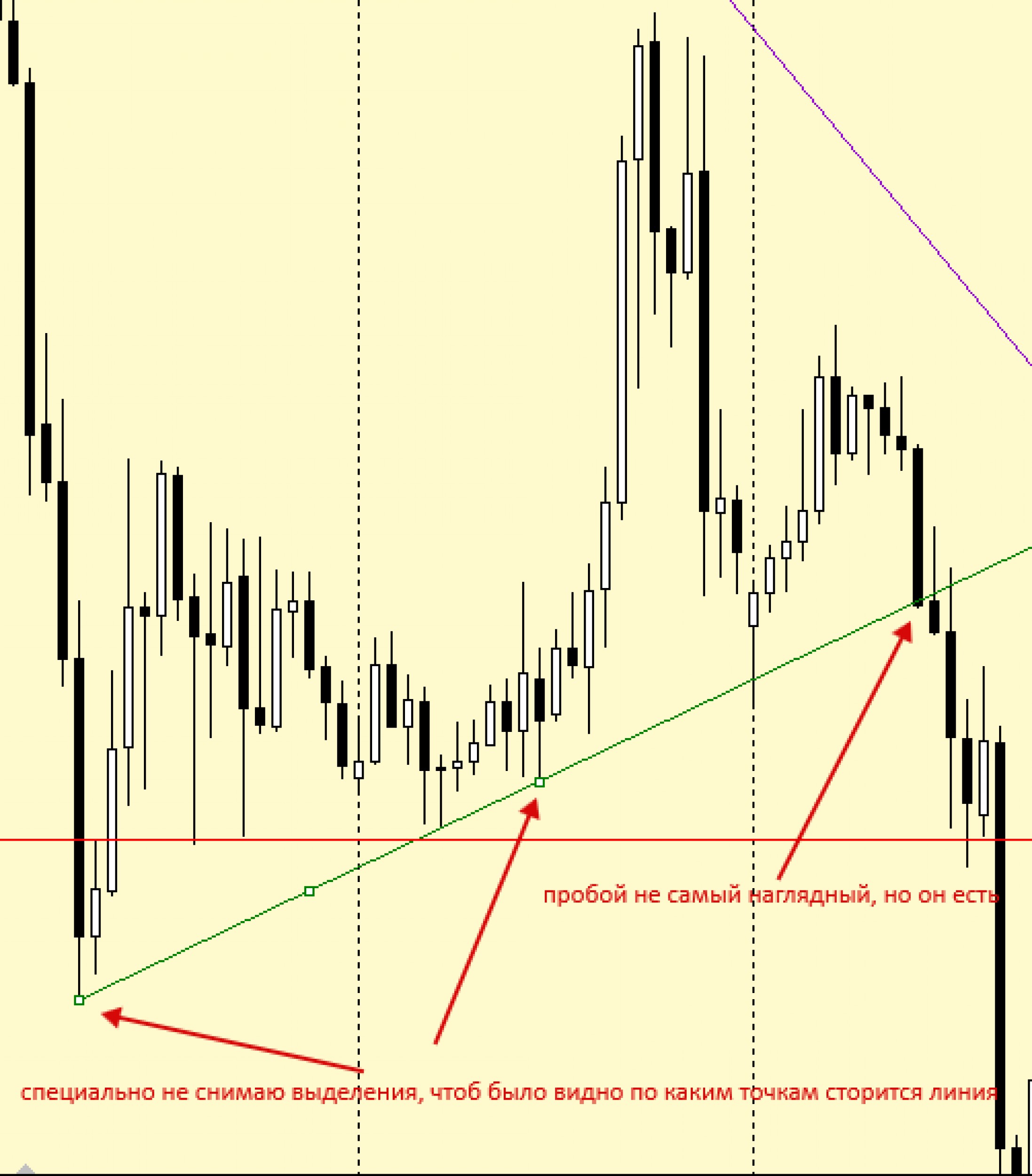 victor, есть две причины для перевода в бу: прохождение указанного расстояния (числовой) и достижение/отбой от важного уровня или линии (графический). В вашем случае, конечно рано было уходить в бу при достижении максимума, однако получив отбой от него точно нужно было выходить… Это, кстати описано в курсе Start Up. Ну и крайний вариант выходить точно нужно было уже после пробоя и тем более тестирования малой восходящей линии.