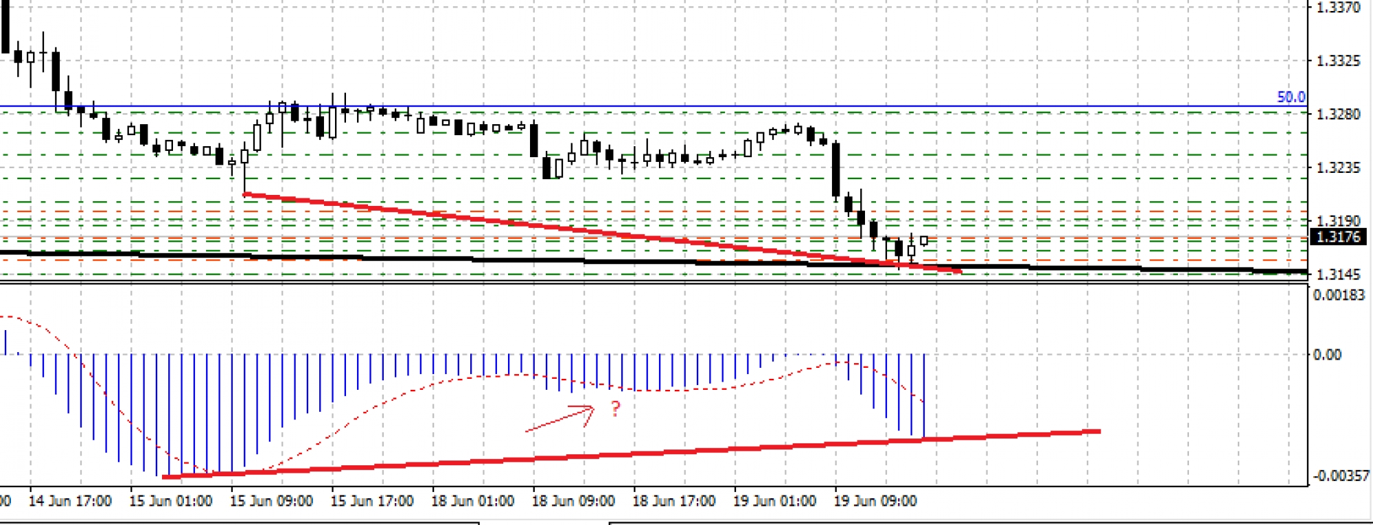 Vadim, думаю да, дивергенция конечно же есть. Линии на графике и гистограмме направлены в разные стороны, соответсвенно расхождение есть, а это и есть дивер. минимум внутри — думаю не помеха