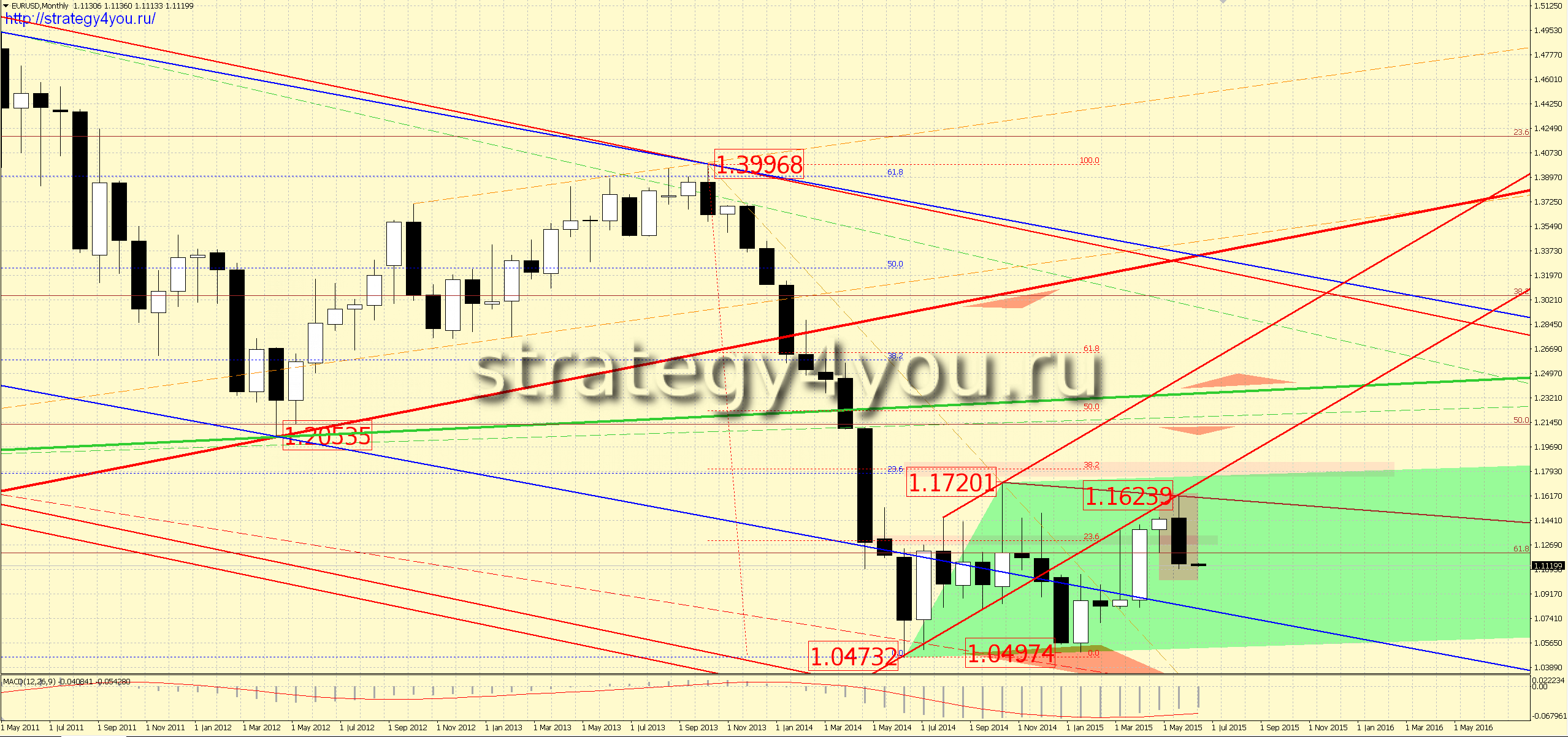 Получили закрытие месяца — свеча черного цвета, закрытая практически на минимуме (цена так и не смогла пробить красный канала на рисунке ниже, а наоборот получили отбой на продажу):