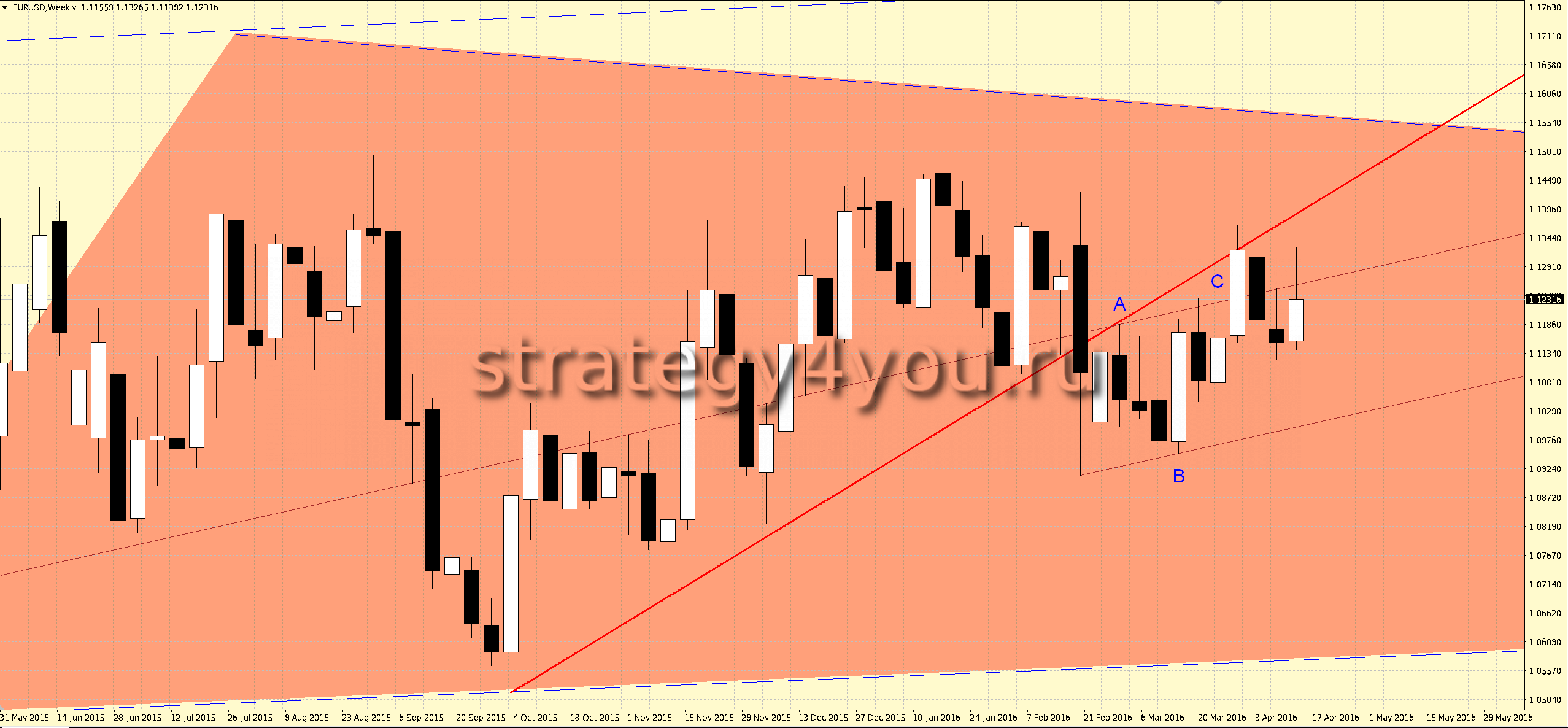 Неделя закрыта белой свечей, но все-таки с более длинным хвостом сверху, которая протестировала на продажу канал АВС (после возврата в него).