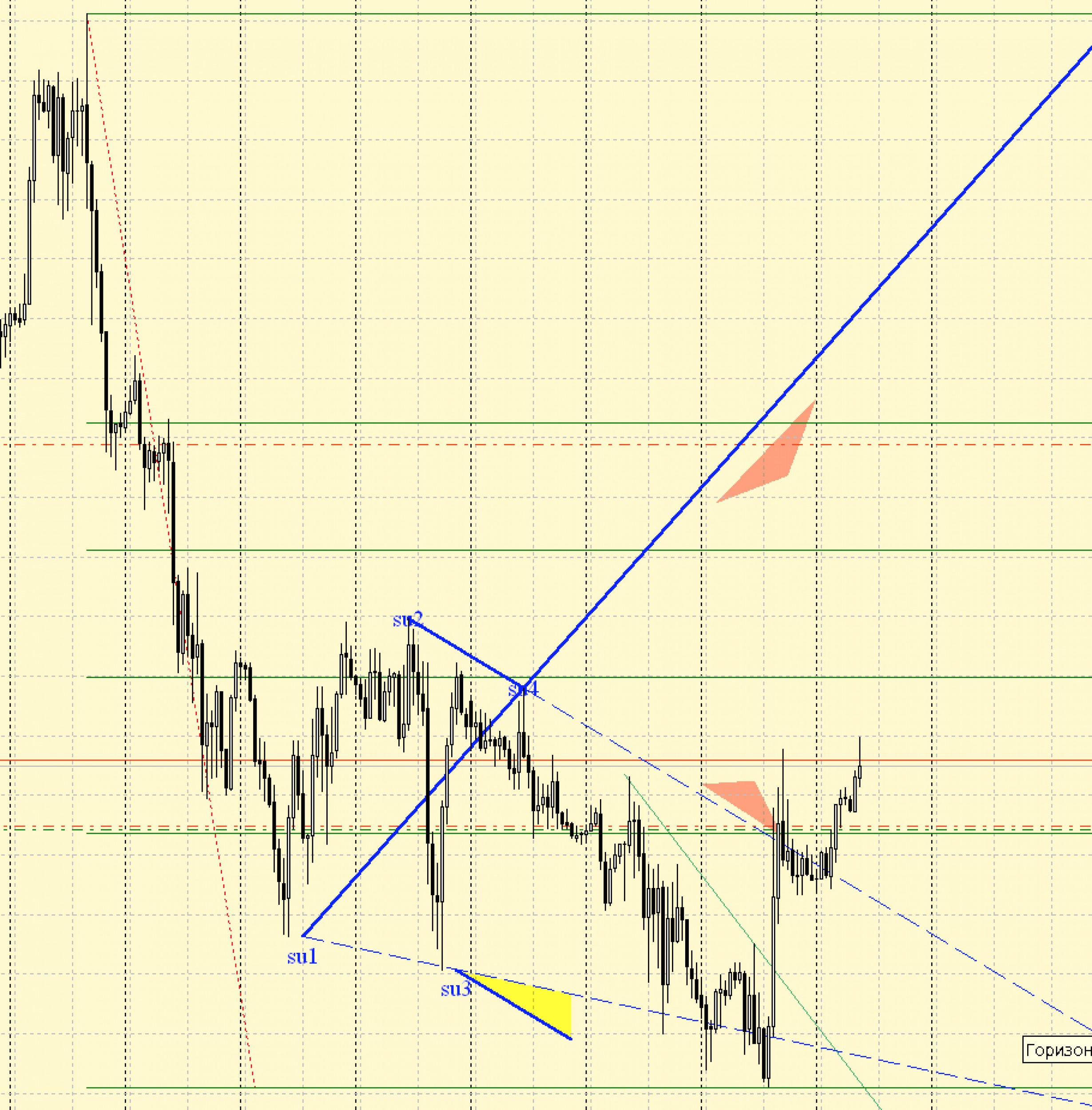 Отбой от точки 5 получили, пробой зеленой получили, но так как он все-таки боковой, а не импульсный, то в данном случаи сигнал не однозначный и рискованный. Лучший вариант (на этот момент) подождать пробой + ретест и отбой линии 2-4.