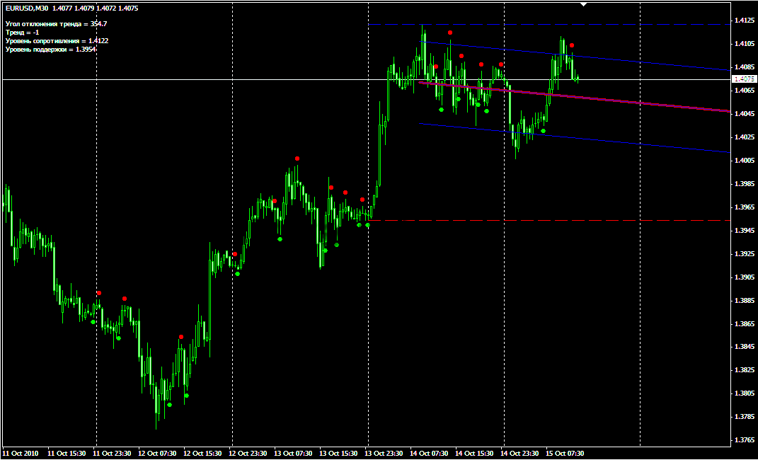 Инструмент самостоятельно интерпретирует значения ADX, сигнализируя про удачные моменты покупки/продажи. Также он находит среднестатистические значения алгоритма и сглаживает рыночные шумы, определяя усредненную точку входа. Интерпретировать сигналы просто: покупать, когда появляется белая точка ниже стоимости открытия свечи и продавать, если появляется красная точка. Лучше всего работает на тридцатиминутных и часовых графиках.