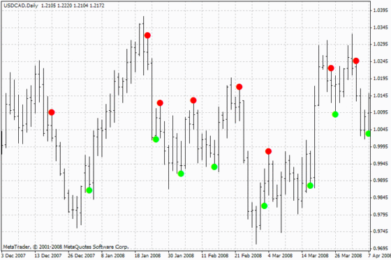 - С индикатором PSAR – это параболический SAR, который также создал Уэллс Уайлдер для трендовых рынков. Сначала определяется тренд, а потом используется данный инструмент в направлении движения цены, который перерисовывает на графике точки, сонаправленные с тенденцией. Торговую систему чаще всего используют в качестве разворотной для установки стоп-лосса.