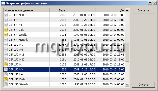 Находим в нем выбранную нами валютную пару и тайм-фрейм H3. Нажимаем кнопочку «Открыть».