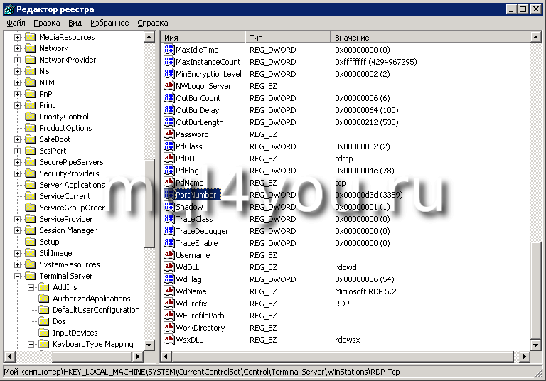 Порт добавлен. Теперь настроим службу терминалов на ожидание соединения по нашему нестандартному порту. Для этого запускаем редактор реестра (ВНИМАНИЕ! Редактирование реестра может привести к неработоспособности операционной системы windows) :