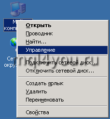 Теперь мы сменим имя пользователя и пароль, чтобы никому кроме Вас они были неизвестны. Запустим управление компьютером (Нажать правую кнопочку мыши на ярлычке «Мой компьютер»):
