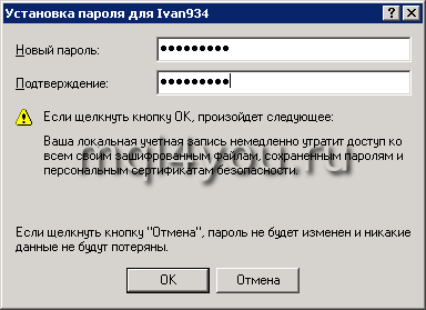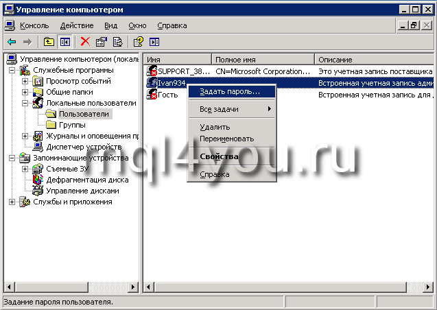 После смены имени пользователя сменим и пароль для него. Для этого опять нажимаем правую кнопочку мыши и выбираем «Задать пароль»: