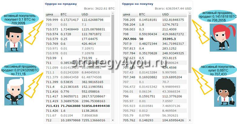 - Чаще всего красным цветом показывают приказы продавцов, а зеленым или синим — покупателей. Особенности оформления могут быть разными в зависимости от сервиса.