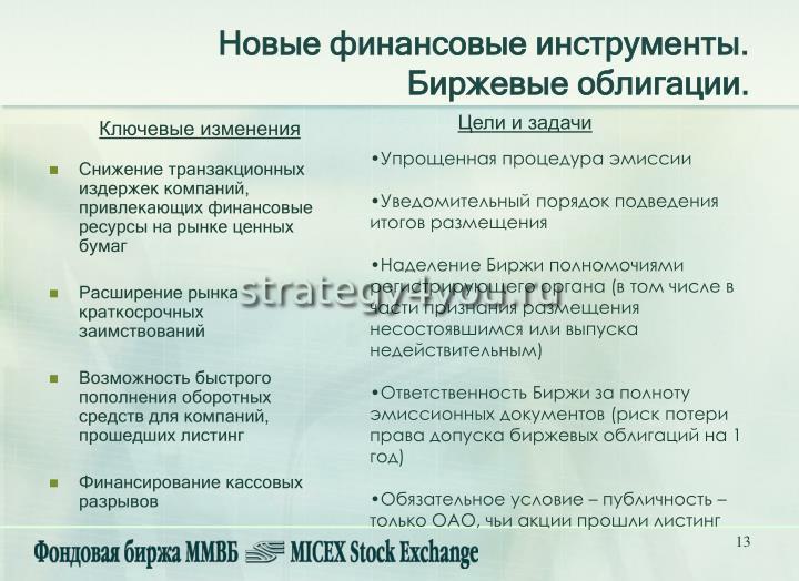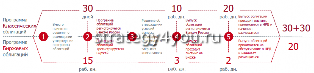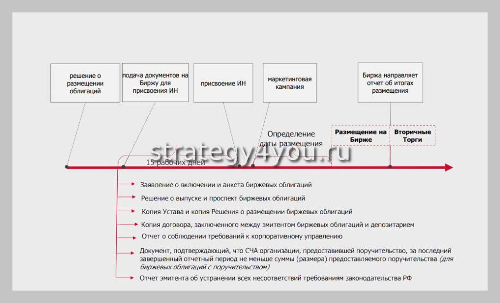 На Московской бирже, к примеру, можно отыскать в личном кабинете эмитента конструктор эмиссионных документов. Около 95% текста идет по стандарту, но согласование всех вопросов все равно отнимает немало времени. Допуск биржевых облигаций подробно описывается в регламенте бирж.