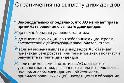 - Финансовое положение компании. Это касается случаев, если есть риск, что АО обанкротится до или после того, как выплачиваются дивиденды; если в наличии акции, по которым может быть предъявлено право выкупа. Либо уставной и резервный капитал превышает стоимость ресурсов.