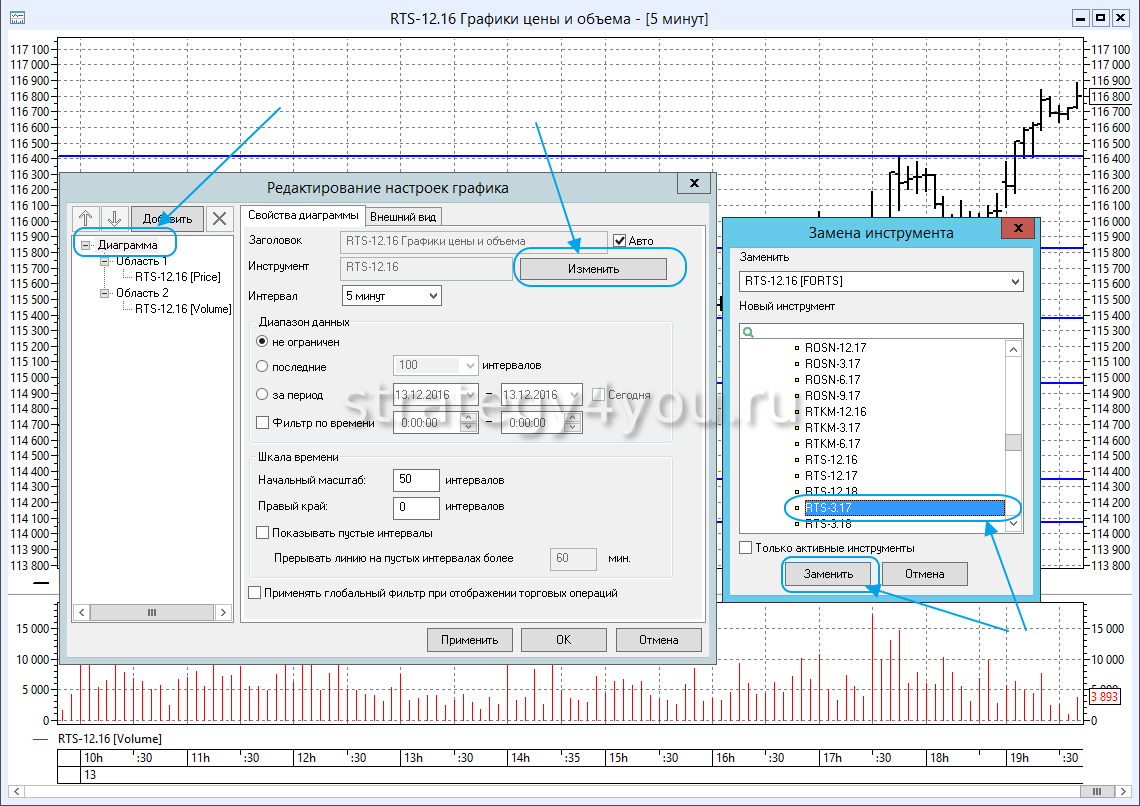 - В новом выпадающем меню выбирают раздел “Диаграмма”. После того как переход будет выполнен, следует нажать на кнопку “Изменить”. При этом изменяют название сделки. Так, при переходе с декабрьского на мартовский контракт необходимо ввести название RIH9.