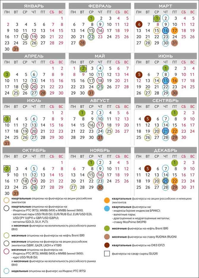 Подавляющее большинство экспираций на бирже относятся к квартальным. Они приходятся на 15-20 числа в марте, июне, сентябре и декабре.