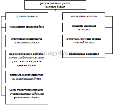 Рынок ценных бумаг может регулироваться и управляться государством в прямой (административной) или косвенной (экономической) форме. Прямое управление рынком государство реализует через установку требований к участникам, их регистрацию и эмитируемые ценные бумаги, выдачу лицензий, обеспечение гласности и информированности, поддержание правопорядка в условиях рынка.