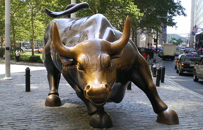 Во многом биржевой сленг формировался в Нью-Йорке, где зародилась первая фондовая биржа. Поэтому самая популярная скульптура быка стоит на Уолл-стрит, у входа в здание Нью-Йоркской фондовой биржи. Бронзовая скульптура весит более 3 т, ее длина составляет почти 5 м, а ширина — 4,7 м. Считается, что если потереть бычьи рога, это принесет удачу в бизнесе и финансовых делах.
