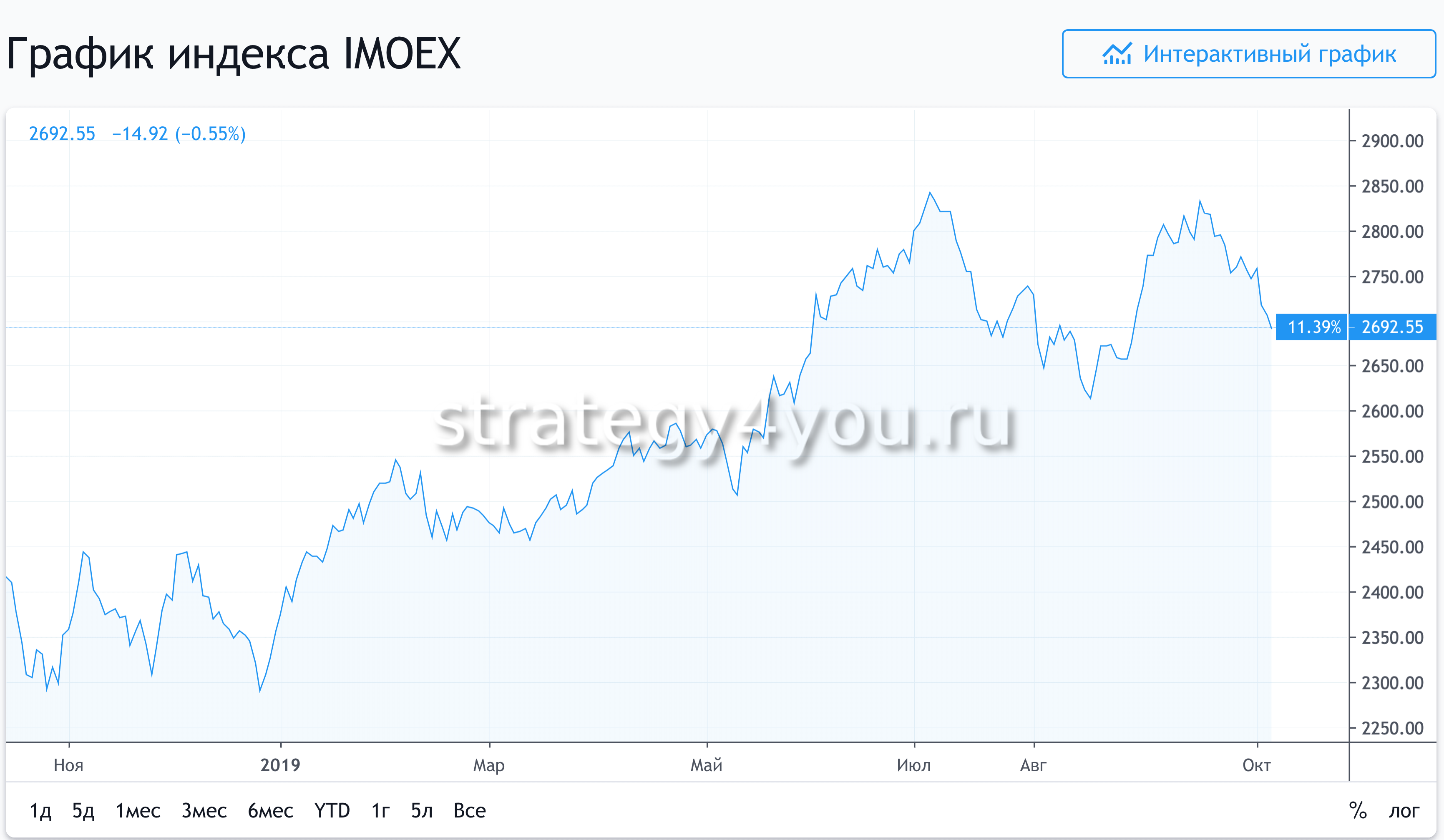 Индекс МосБиржи отражает относительный уровень капитализации входящих туда организаций. График данного финансового инструмента демонстрирует его динамику в стоимостном выражении. Если показатель растет, это говорит о подъеме российского фондового рынка и росте его капитализации. Падение параметра отражает снижение биржевых котировок акций и преобладание медвежьих настроений.
