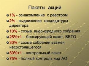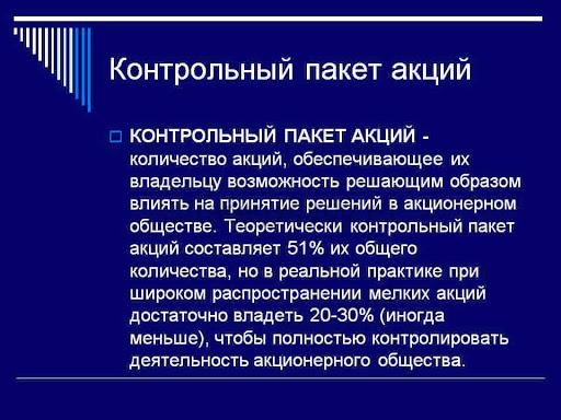 Контрольным считается пакет активов, в котором содержится не меньше 50% + 1 ценная бумага. Такой объем позволяет полностью управлять деятельностью предприятия. Основной акционер часто является учредителем компании, имеет право накладывать вето на решения, а еще его голос имеет больший вес, чем у других акционеров.