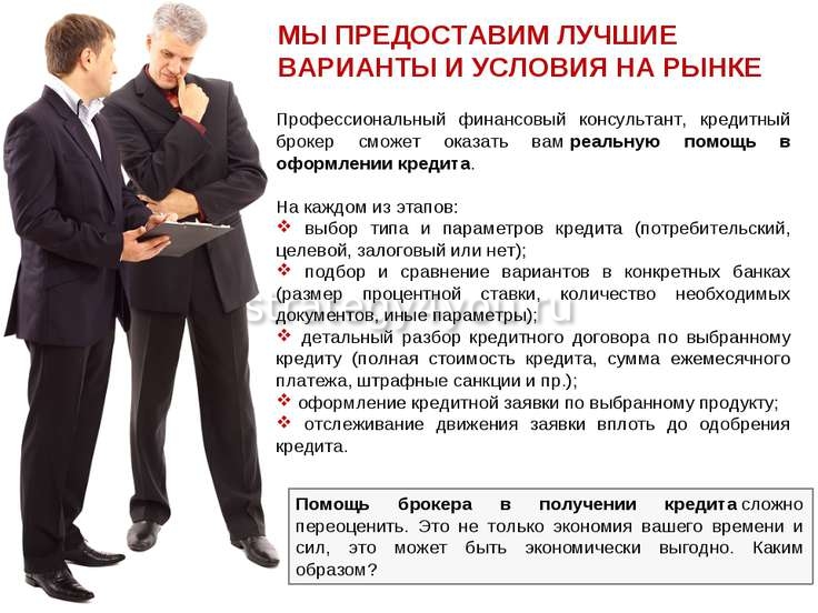 Всеми вопросами, касающимися поиском оптимальной программы кредитования, занимается брокер.