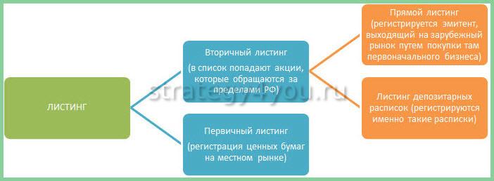 - Dual listing – двойной листинг, предполагает последовательное получение доступа ЦБ эмитента на несколько разных бирж в одной стране. Так повышают ликвидность акций.