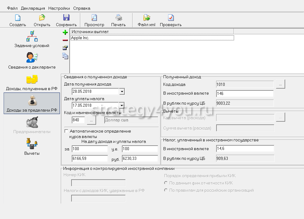 - Если есть прибыль, полученная за пределами РФ, например на иностранных площадках, то необходимо заполнить раздел «Доходы за пределами РФ». Каждая выплата вносится отдельно с учетом того, что если доход принесли дивиденды, то указывается компания-эмитент. Если доход образовался от реализации бумаг, указывается брокер. Датой уплаты платежа является день поступления прибыли на счет.