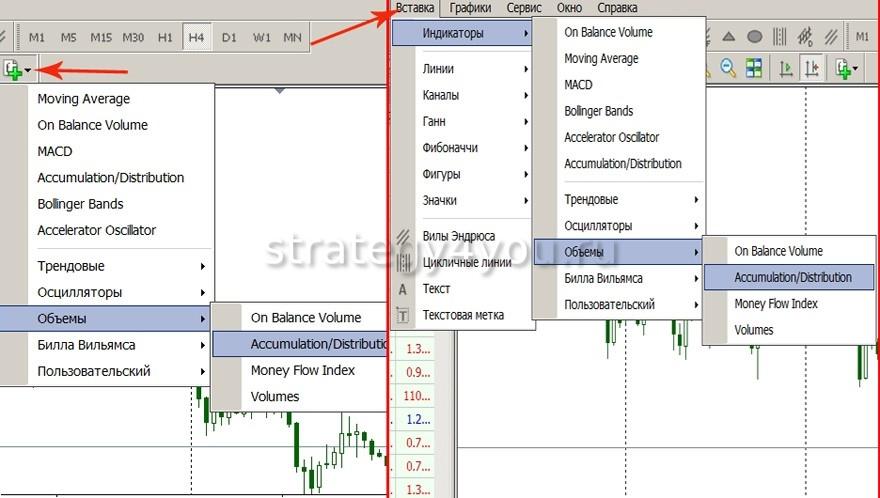 Под анализируемым графиком возникнет красная ломаная линия, которая и является индикатором накопления/распределения.