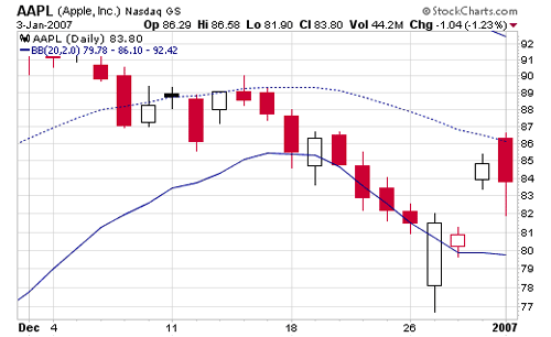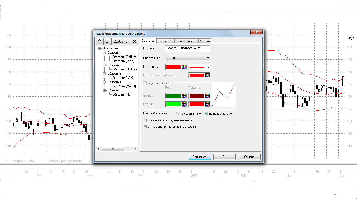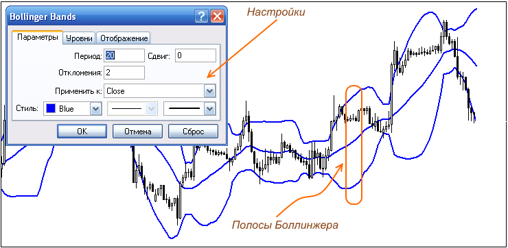 Чаще всего при расчетах средней линии применяют простое скользящее среднее со значением периода 20, а для установления границ берут 2 стандартных отклонения.