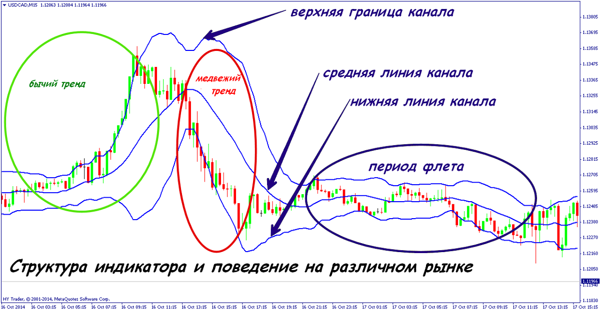 В графическом виде индикатор представляет собой 3 полосы: 1 — средняя и 2 — по бокам, которые ограничивают график.